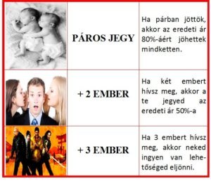 Létezik kedvezményes páros jegy a tréningre, vagy ha hozol magaddal 2-3 főt, akkor érvényesíthető számodra kedvezmény, érdemes csoportosan jönni emiatt. Vagy ha vannak munkatársaid, olyan kapcsolataid, akiknek érdemes ott lenniük szerinted, akkor szólj nekik! A kedvezmények így néznek ki (ha 3-nál több embert szeretnél hozni, ott már pénzt keresel, ilyen is van, akkor szólj külön, ha ezt szeretnéd, az insudeb@gmail.com címen elérsz) :